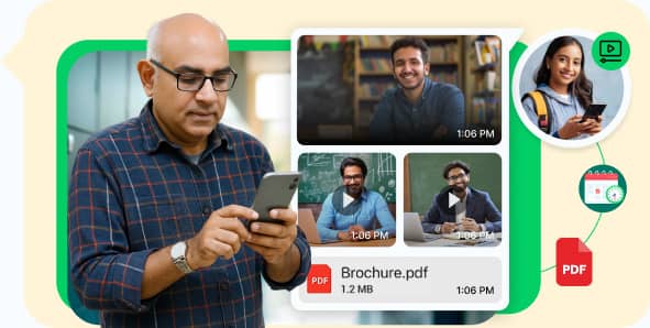 Send brochures, syllabus PDFs, video tutorials, class schedules, and event invites directly via WhatsApp.